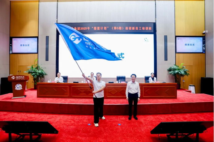 马可辉向新员工代表授予集团司旗。